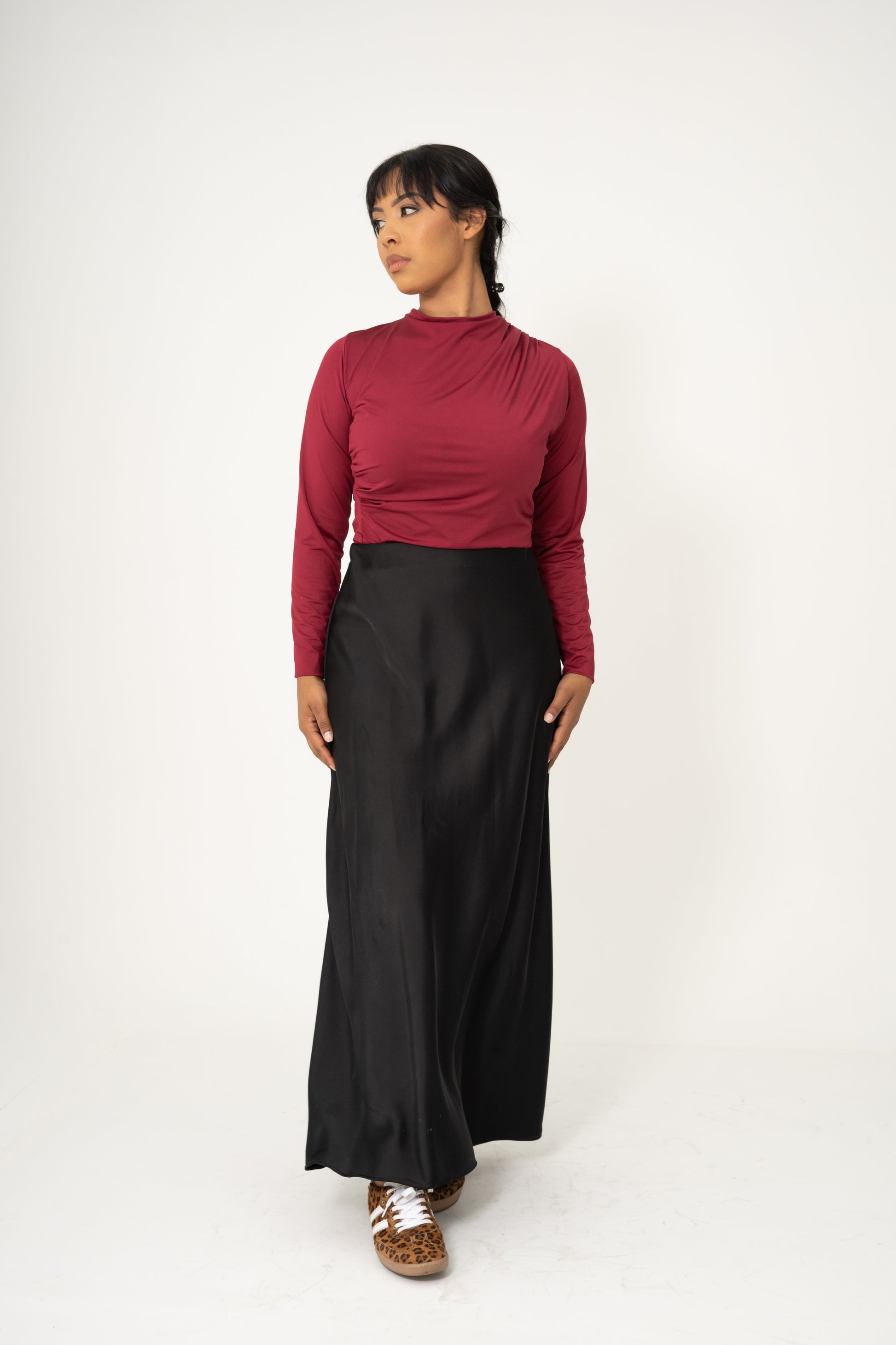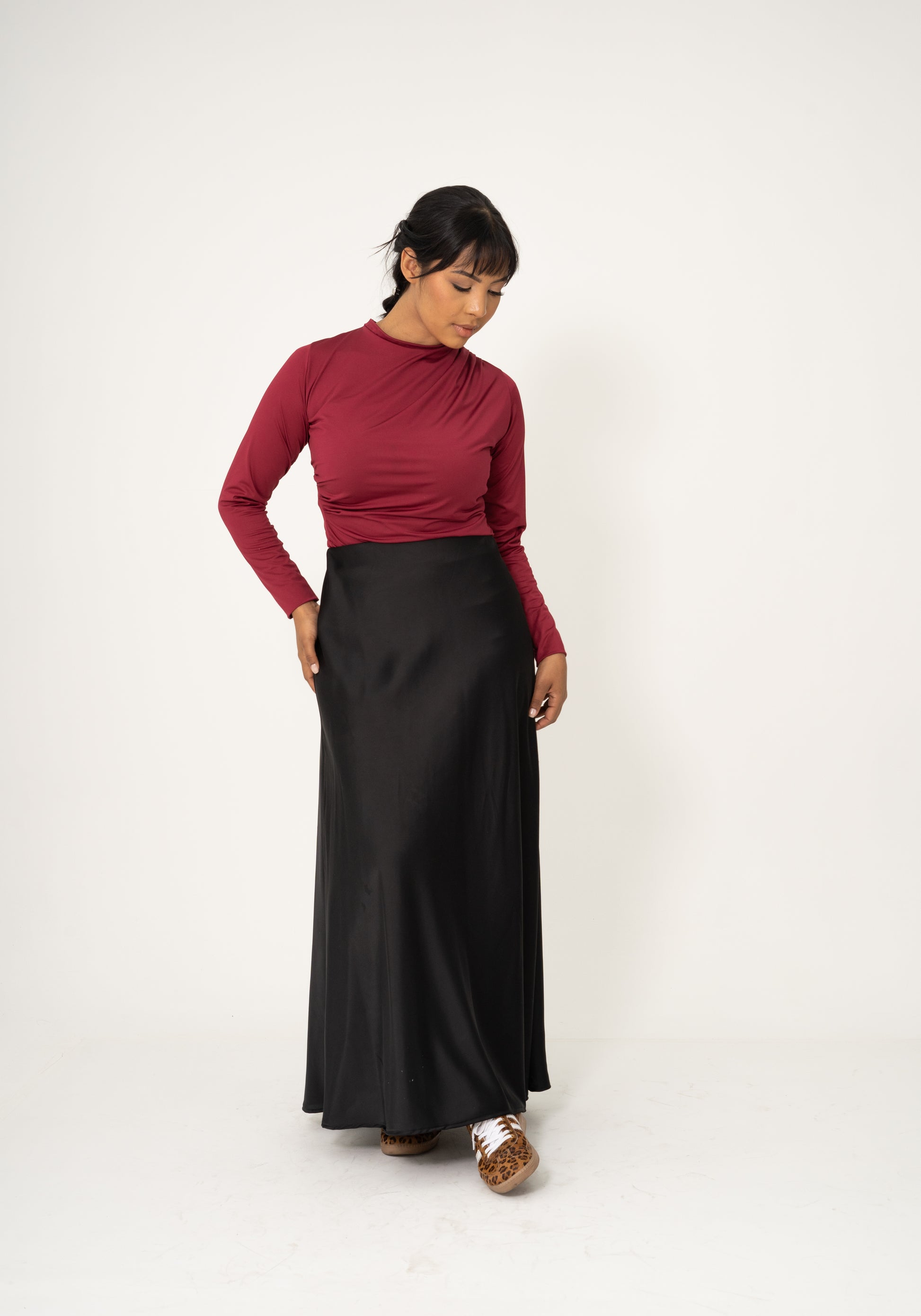 Larga, fluida y con ese brillo sutil que solo el satín puede. aportando elegancia sin esfuerzo. Ideal para looks formales o para elevar un outfit casual.