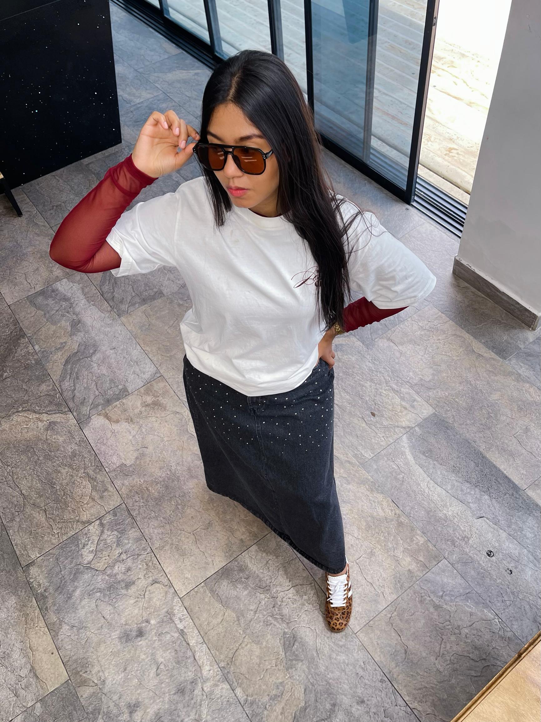 Falda de jean negro con aplicación de piedrería en Murano que eleva cualquier look. Una prenda versátil, moderna y con el toque de brillo perfecto para destacar de día o de noche. Combínala con básicos o hazla protagonista en un outfit más arriesgado.”