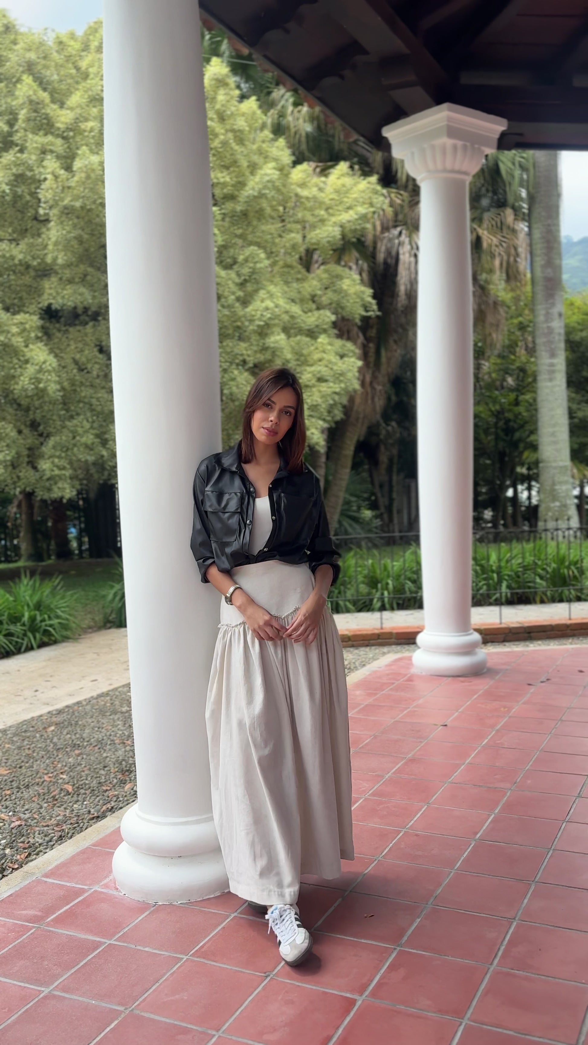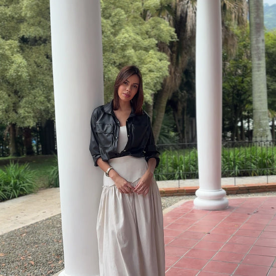 Falda en lino con fruncidos que forman delicados pétalos, creando textura y movimiento en cada paso. Inspirada en la belleza de lo natural, esta pieza une la frescura del lino con la sutileza del diseño floral. Ligera, femenina y con un detalle que la hace única.