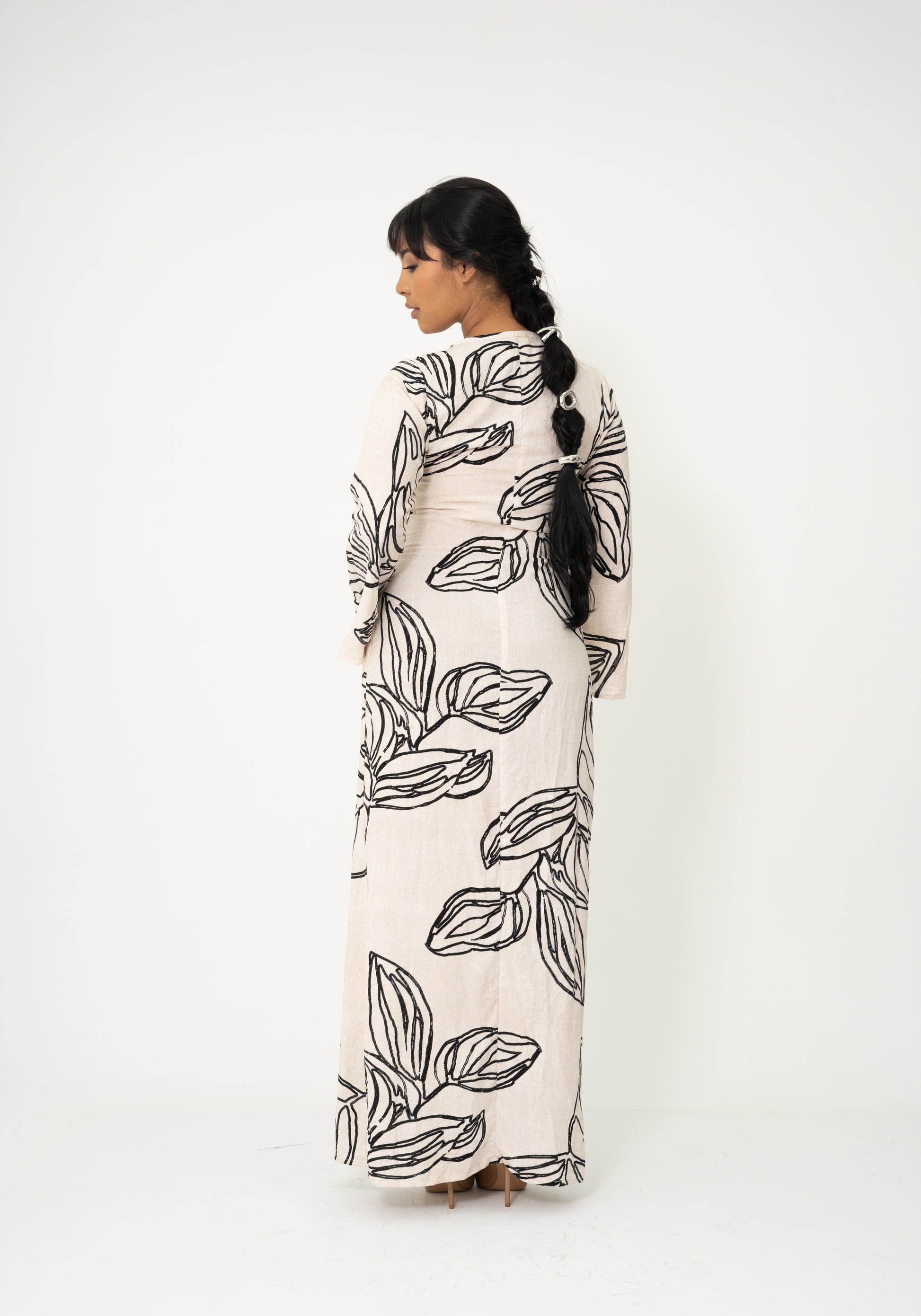 Vestido largo con drapeado en la cintura que realza la silueta de forma natural. Su estampado de hojas negras sobre fondo beige transmite elegancia y calma, como una raíz firme entre la naturaleza. Ideal para ocasiones especiales o para esos días en los que quieres sentirte conectada, fuerte y femenina al mismo tiempo.